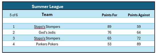 Pokers started out red hot as captain Brian Parker took all three points from debutant Alistair Machray MBE. Lesley Cooley then took 3 points against arch-rival Tom Mairs in a 5 setter to level the tie. Stephen Harrison and Colin Winstanley then took strong wins to cement the Stompers title credentials. Paul Smith was back on court, like Everton, back on the up. The in-form Darren Reid then claimed 3 points against Paul Grannon . To stem the tide, Mark Evans fought back from 2-0 to claim a close match against Andrew Potts . Dan Parker then completed the rout with a 3-1 win over battle ready Karl Mullins . An impressive 22-12 win to the Stompers, putting them out ahead for the big showdown on September 2nd.